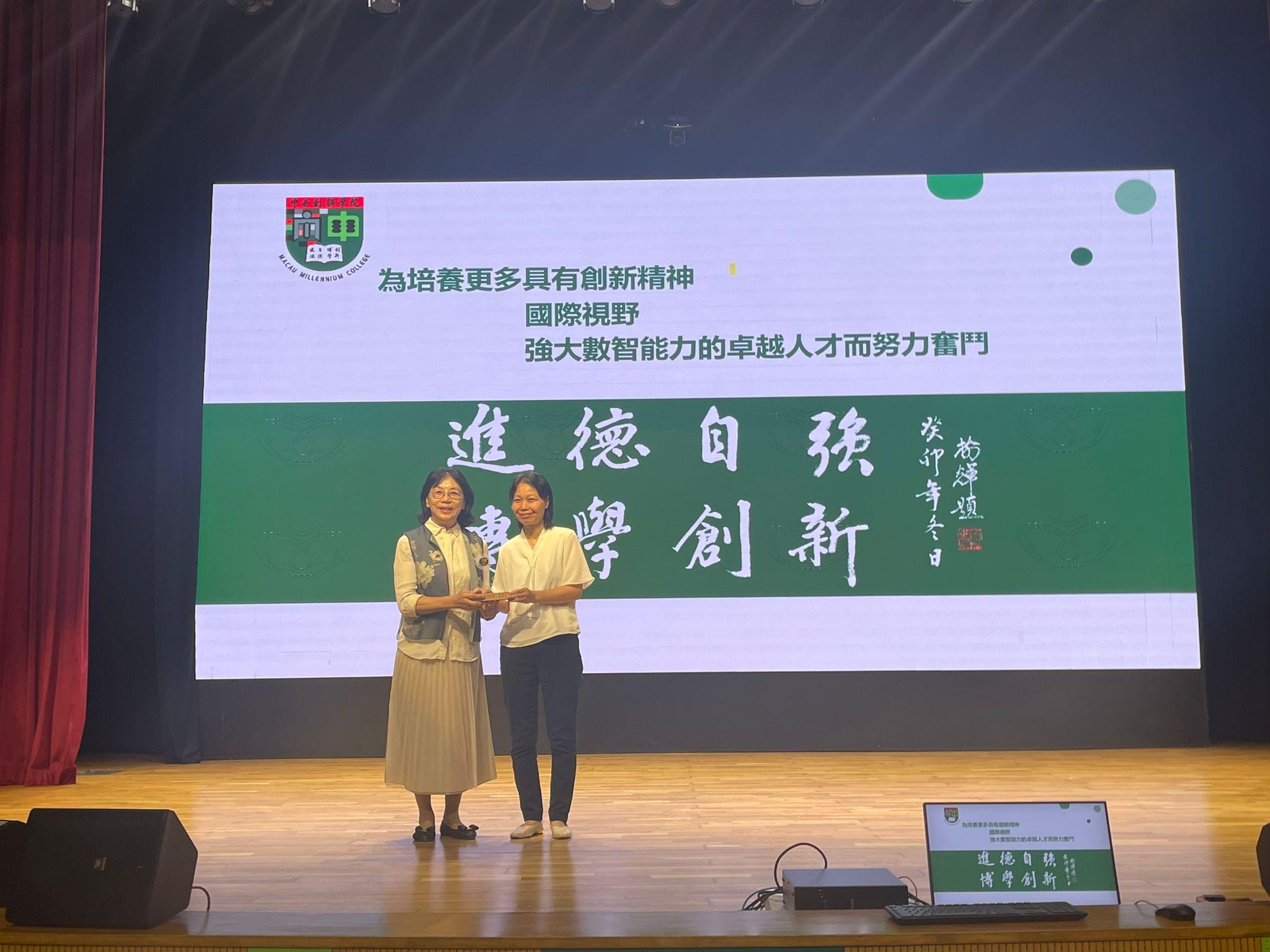 中西創新學院教育學院院長李慧勤教授代表學校向中葡職業技術學校贈送紀念品,感謝校方的熱情接待與支持。她表示,學校以“數智+”為特色,致力於推動創新教育,並積極與本地中學建立合作平台,讓學生能夠更早接觸高等教育資源,拓展視野,為升學及未來發展作好準備。她強調,期望未來雙方能持續深化合作,共同為本地教育發展貢獻力量。