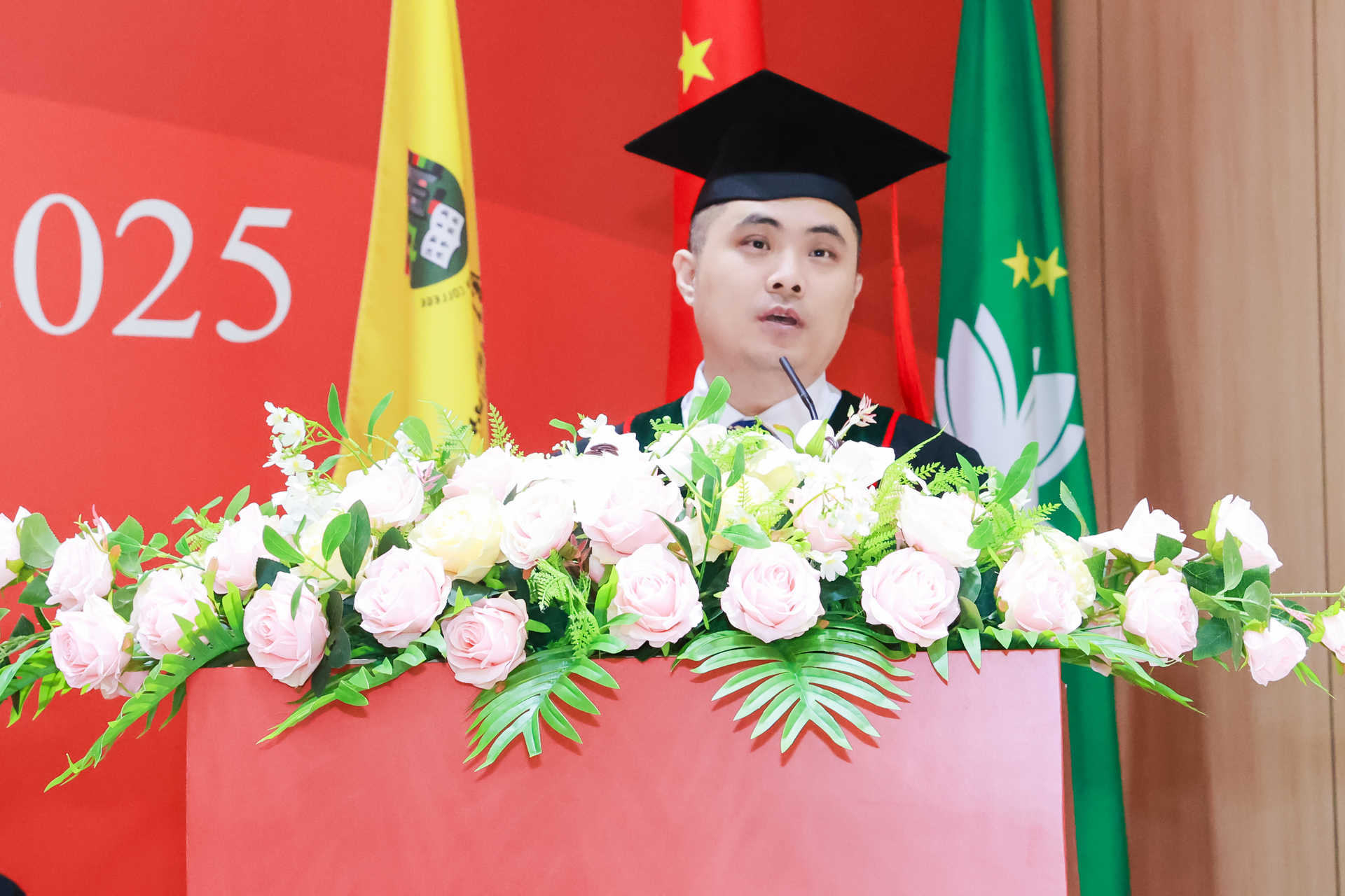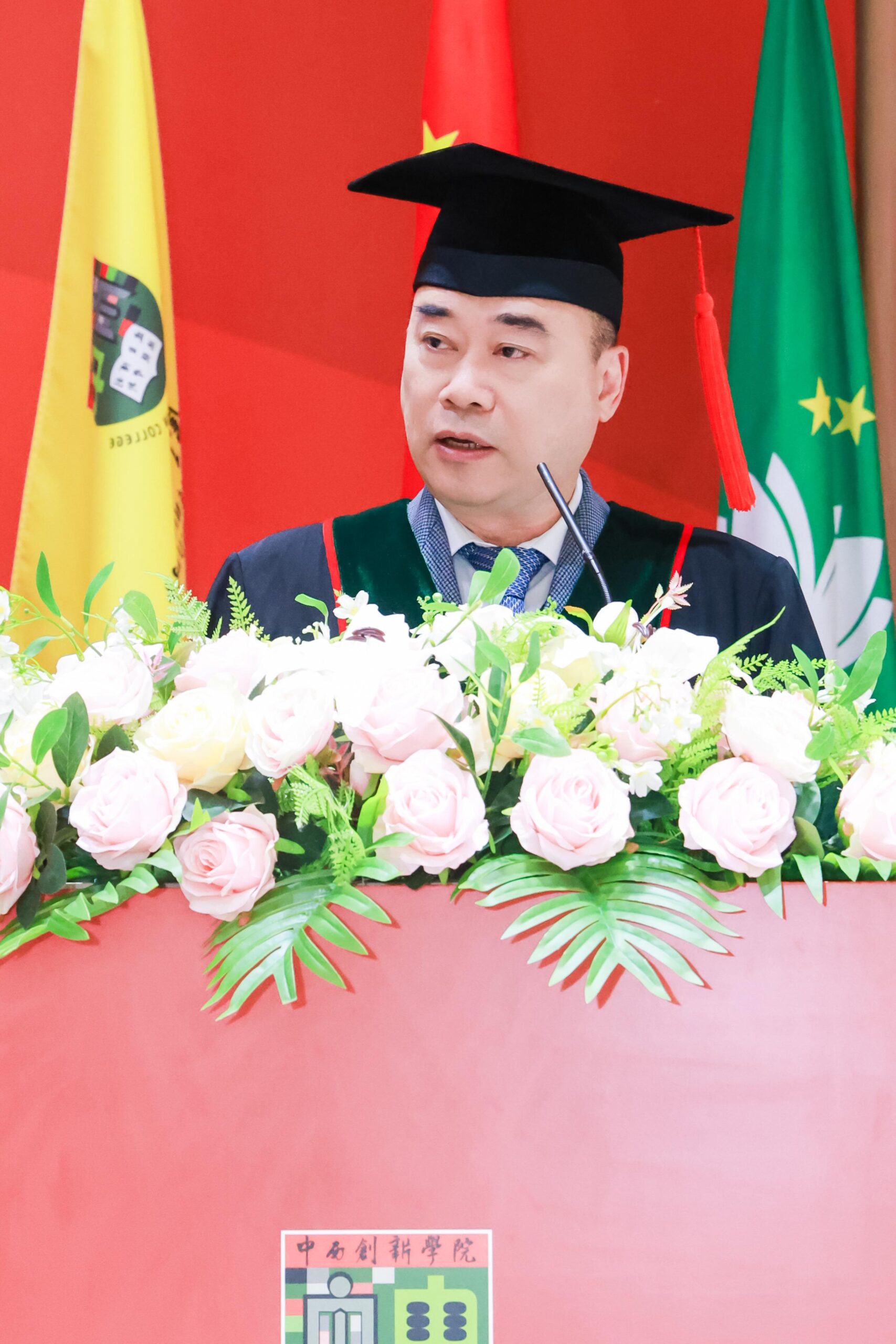教育及青年發展局代副局長陳旭偉在致辭中表示,青年是國家和澳門發展進程中的重要力量。中西創新學院作為澳門高等教育發展的重要平台之一,長期助力澳門推動“教育興澳、人才建澳”理念。他讚許學校畢業生在繁忙的工作與生活中仍堅持自我提升,展現出澳門青年勤奮進取、勇於向上的精神風貌,並寄語畢業生將在中西創新學院所汲取的知識與能力轉化為未來的核心競爭力,持續深耕專業領域,為澳門經濟適度多元化發展貢獻力量。
