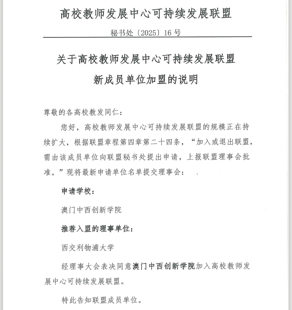 近日,中西創新學院正式加入「高校教師發展中心可持續發展聯盟」,與中國內地高校教師發展機構進一步深化協同合作,圍繞教師發展體系建設、教學能力提升與可持續發展實踐等重點領域,搭建資源共享與互學互鑒平台,共同推動中澳高校教師發展工作高質量、可持續發展,最終促進學生的學習與健康成長。