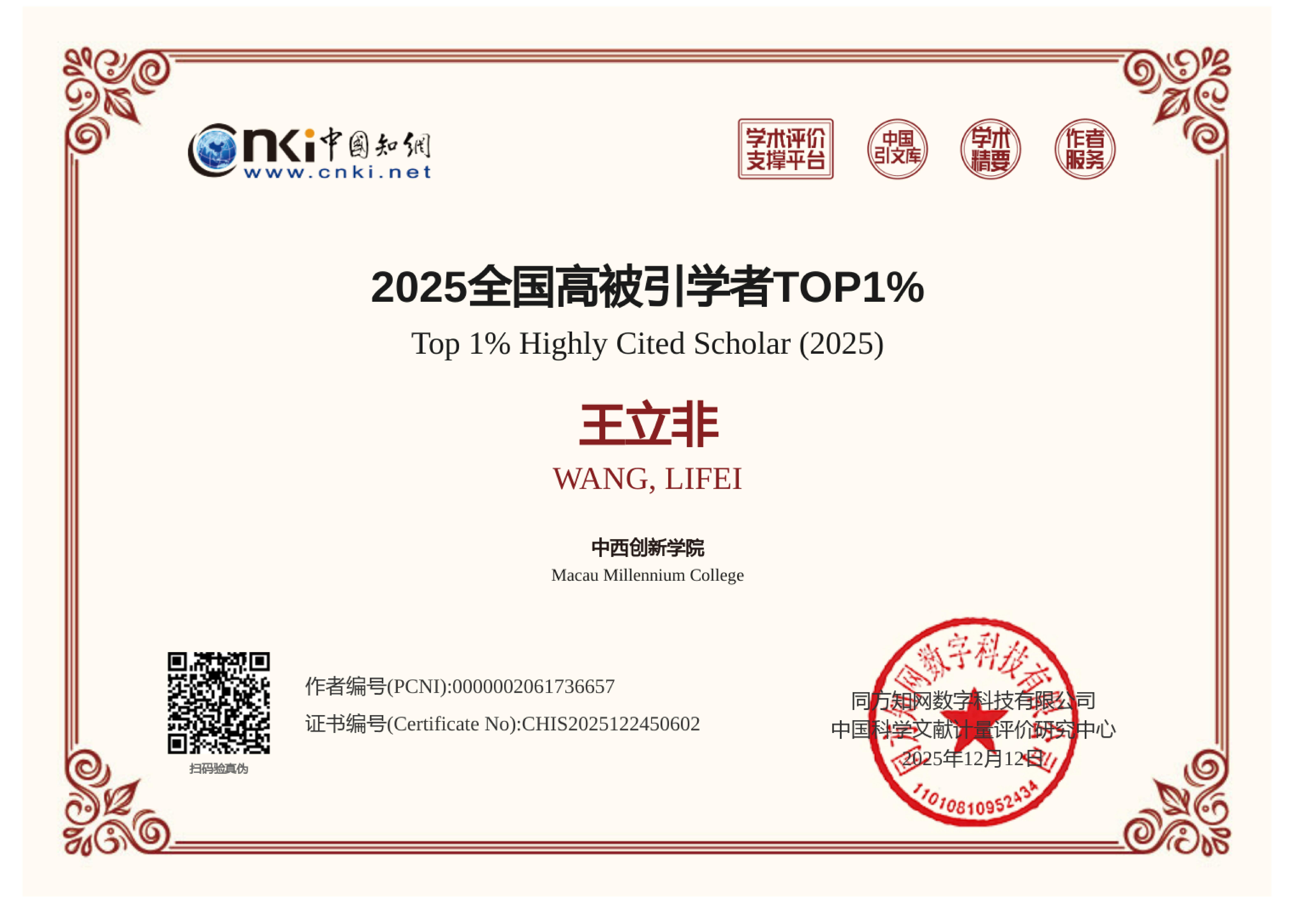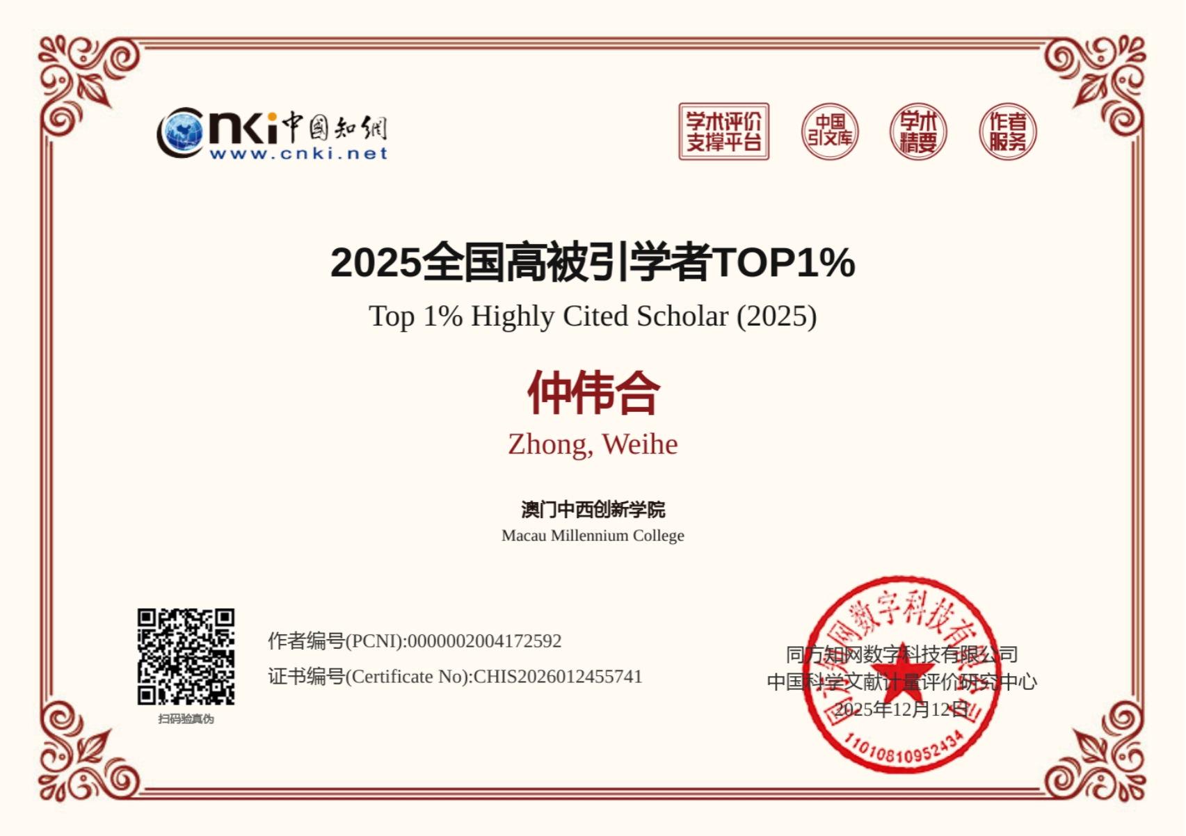 2025年,中西創新學院教授於國際、國家級學術評價中表現突出,屢獲殊榮。在近期公布的2025年度“外國語言文學中國知網高被引學者”榜單中,校長仲偉合教授、副校長王立非教授雙雙位列全國高被引學者前1%,體現出二人在該學科領域的卓越學術貢獻與深遠影響力。 據悉,本次入選外國語言文學學科全國高被引學者前1%的學者中,澳門地區共有3位,我校占兩席,進一步彰顯了學院在語言學及相關研究領域的領先地位。