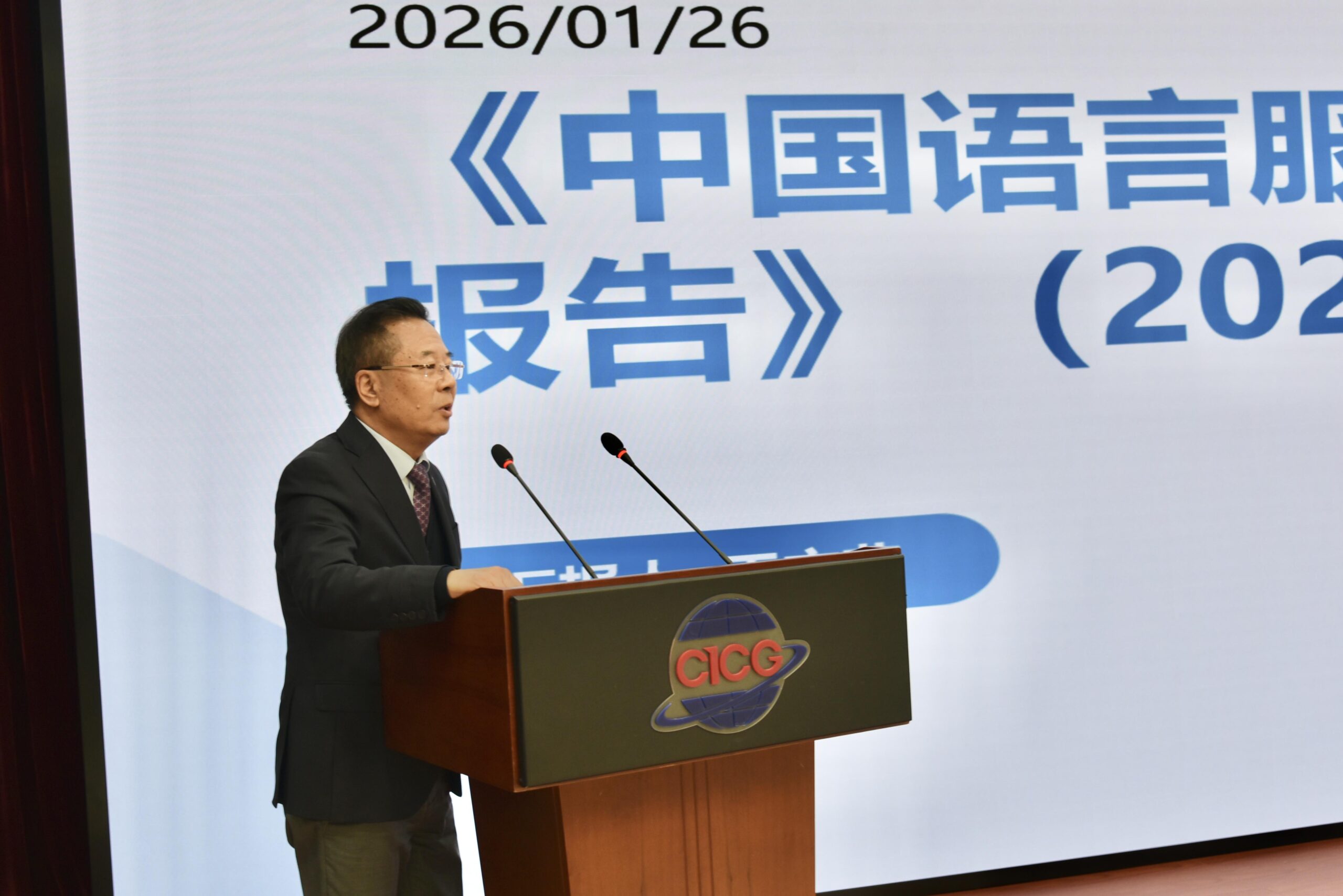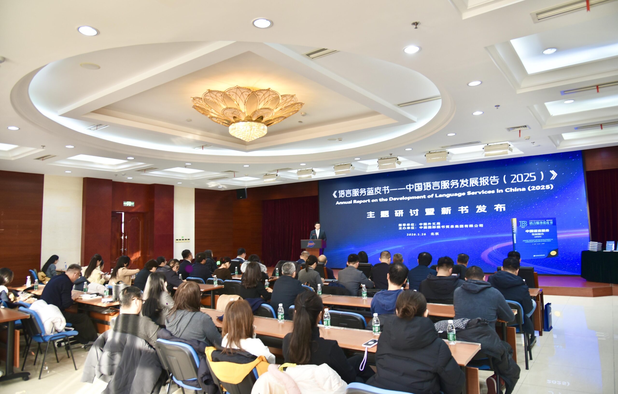 2026年1月26日,由中國外文局指導、中國國際圖書貿易集團公司主辦的《語言服務藍皮書——中國語言服務發展報告(2025)》主題研討暨新書發佈活動在北京舉行。中國外文局副局長謝剛、商務部服務貿易和商貿服務業司二級巡視員(副司級)朱光耀、教育部語言文字應用管理司二級巡視員周道娟、中國外文局計劃財務部副主任楊秀端等有關部門領導,中西創新學院校長、報告編委會主任仲偉合教授、中西創新學院副校長、《語言服務藍皮書(2025)》主編王立非教授,中國出版協會副理事長、新譯研究院院長謝壽光等業界嘉賓,以及語言服務院校代表,首批特色服務出口基地(語言服務)代表等40余位嘉賓出席活動。國圖集團副總經理、國際傳播科技文化園管委會主任高曉強主持活動。