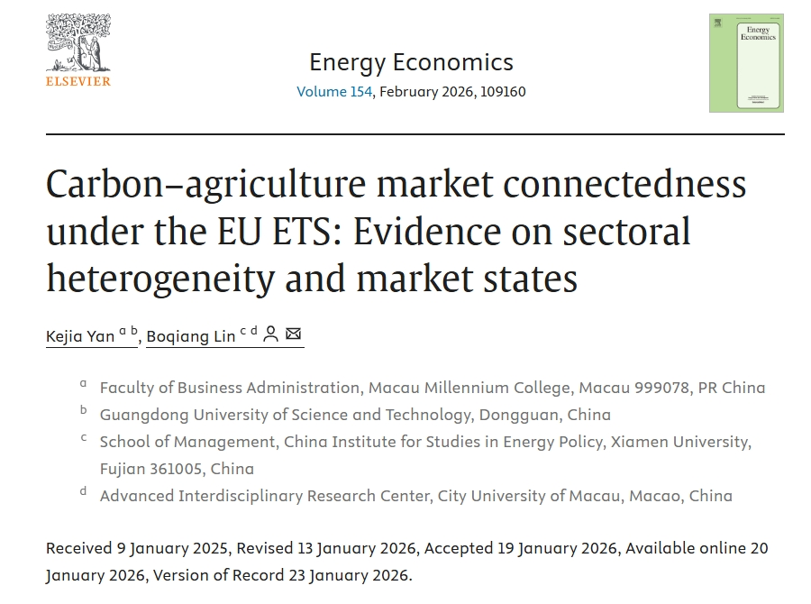 中西創新學院工商管理學院閻可佳助理教授的最新研究論文 “Carbon–agriculture market connectedness under the EU ETS: Evidence on sectoral heterogeneity and market states”,近日正式發表於中科院經濟學頂刊《Energy Economics》。EE,為SSCI與JCR雙Q1,影響因子14.2,為JCR經濟學分區排名第一1/620,是全球學界公認的權威平台。此次閻可佳助理教授能於此期刊發表研究成果,不僅彰顯了其在能源經濟、碳市場、氣候政策研究中的領先地位與國際競爭力,更標誌著中西創新學院在能源政策研究、資源治理與碳市場發展研究方面的科研實力再度獲得國際高度肯定。