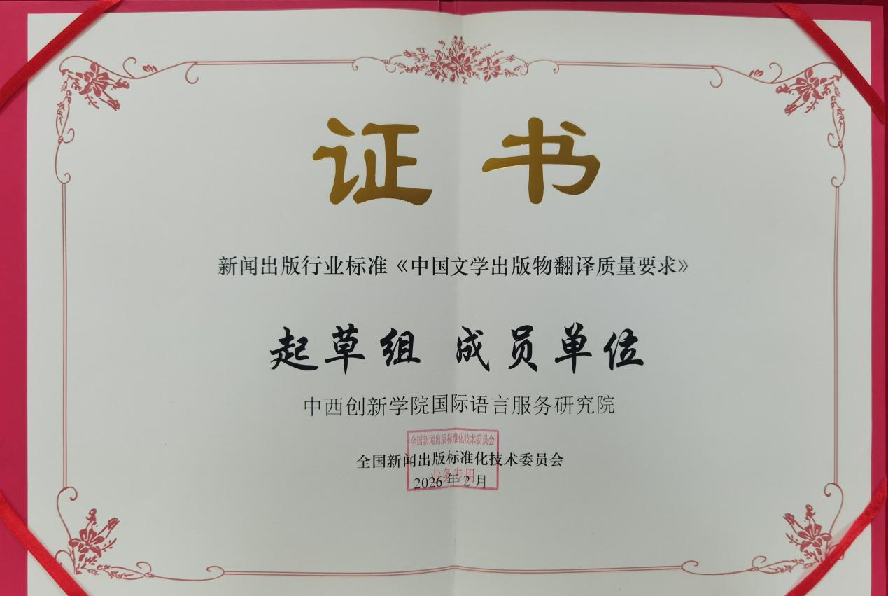 中西創新學院國際語言服務研究院近日獲批成為《中國文學出版物翻譯質量要求》行業標準「起草組成員單位」。