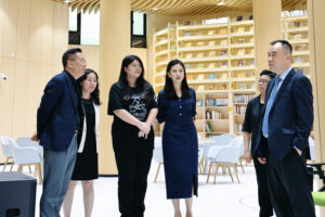 中西創新學院副院長王立非、教務及研究生處處長董旭梅代表學校熱烈歡迎陳旭偉一行,隨後陪同考察團參觀新校區智能化教學環境及設備,重點展示了本校教師團隊自主研發的智能書架、文旅實驗室及多語智能實驗室等設施,直觀呈現學校在數智化教學與科技創新育人方面的探索成果。陳旭偉一行察看設施運行、聆聽相關介紹,對新校區空間布局與智能化建設的顯著提升給予高度評價,充分肯定學校在教學硬件升級及創新育人環境打造上的成效與用心。