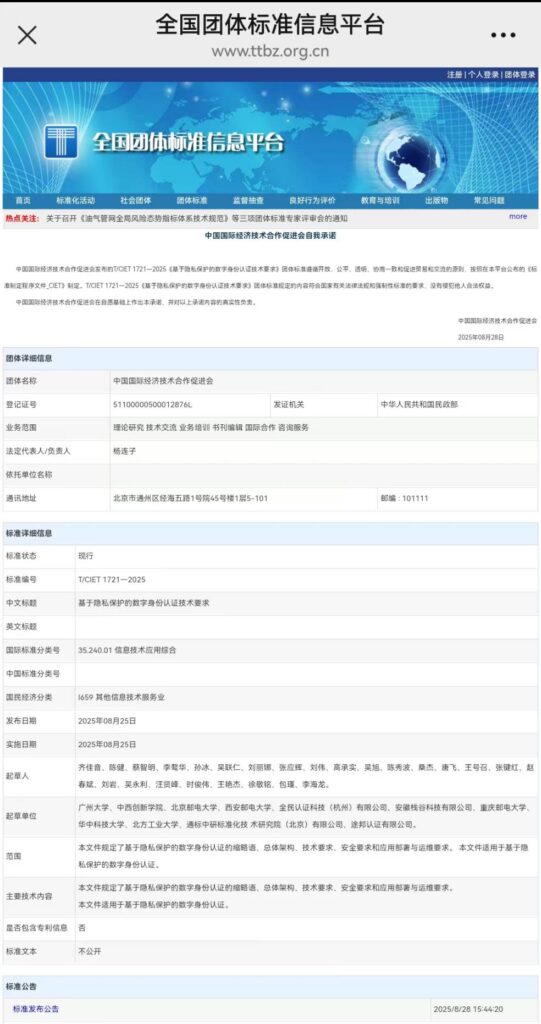 Recently, the group standard Technical requirements for privacy-preserving digital identity authentication (hereinafter referred to as “the Standard”), organised by the China Association for Promoting International Economic & Technical Cooperation, was officially released. The Standard was jointly drafted by Professor Cai Zhiming, Vice Rector of Macau Millennium College (“MMC”), his team, and teams of experts and scholars from Academician Fang Binxing of Guangzhou University, Beijing University of Posts and Telecommunications, Xi’an University of Posts and Telecommunications, Chongqing University of Posts and Telecommunications, Huazhong University of Science and Technology, North China University of Technology, and Beijing Tongbiao Zhongyan Standardisation Technology Research Institute Co., Ltd.